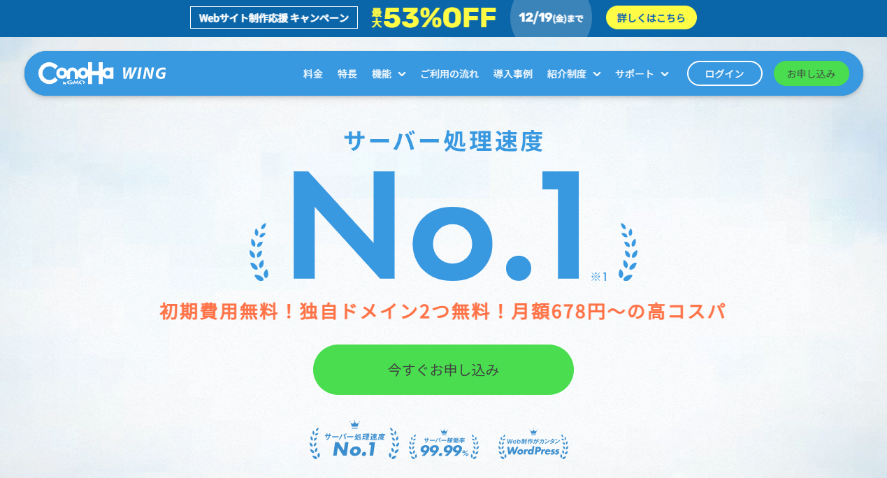 国内最速のConoHa Wingが2025年12月19日(金)16:00まで下記キャンペーン中です。