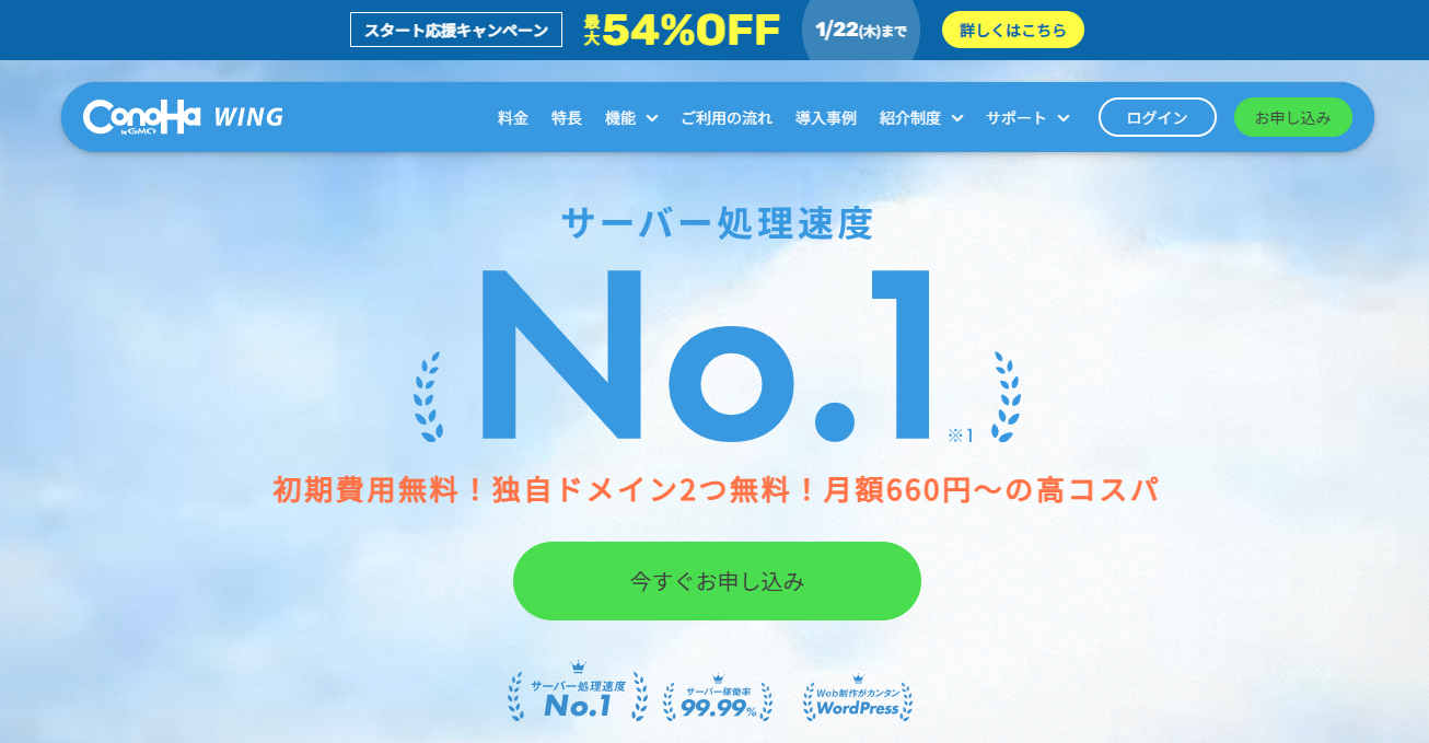 国内最速ConoHa Wingが2026年1月22日(木)16:00まで下記キャンペーン中です。