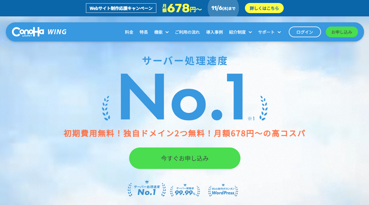 国内最速のConoHa Wingが2025年11月6日(木)16:00まで下記キャンペーン中です。