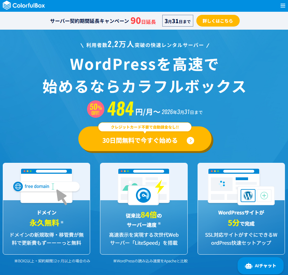 「.com」や「.net」などの人気ドメインが、サーバー契約が続く限り2つ永久無料です。