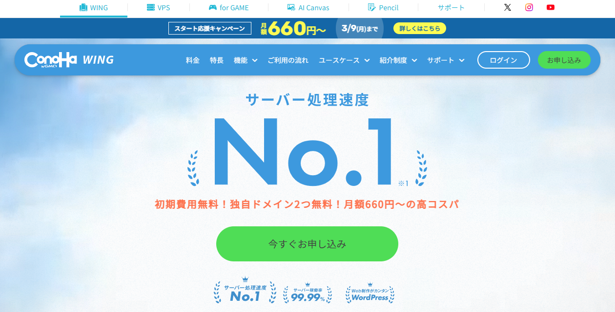 国内最速のConoHa Wingが2026年3月9日(月)16:00まで下記キャンペーン中です。