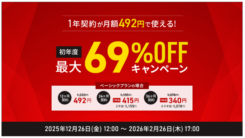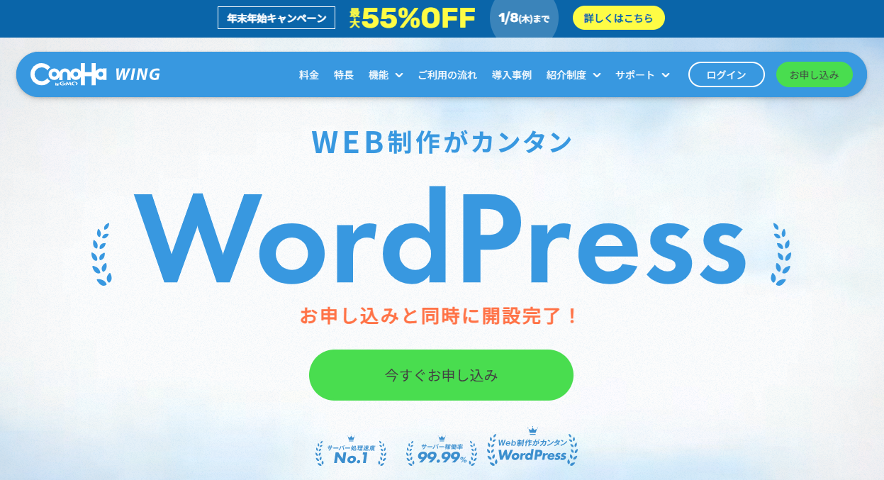 国内最速のConoHa Wingが2026年1月8日(木)16:00まで下記キャンペーン中です。