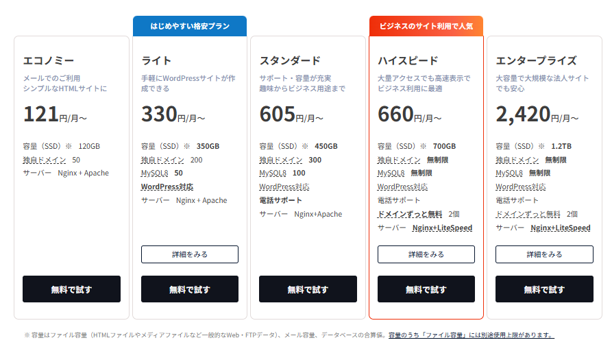 ※WordPressは、ライトプラン、スタンダードプラン、ハイスピードプラン、エンタープライズプランで利用できます。