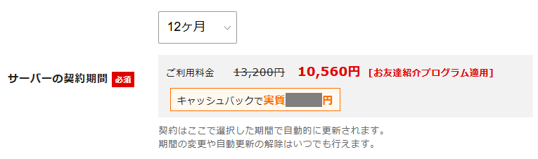 すると、ご利用代金が12か月の利用が13200円のところ、お友達紹介プログラム適用で20%割引されて10,560円になりました。